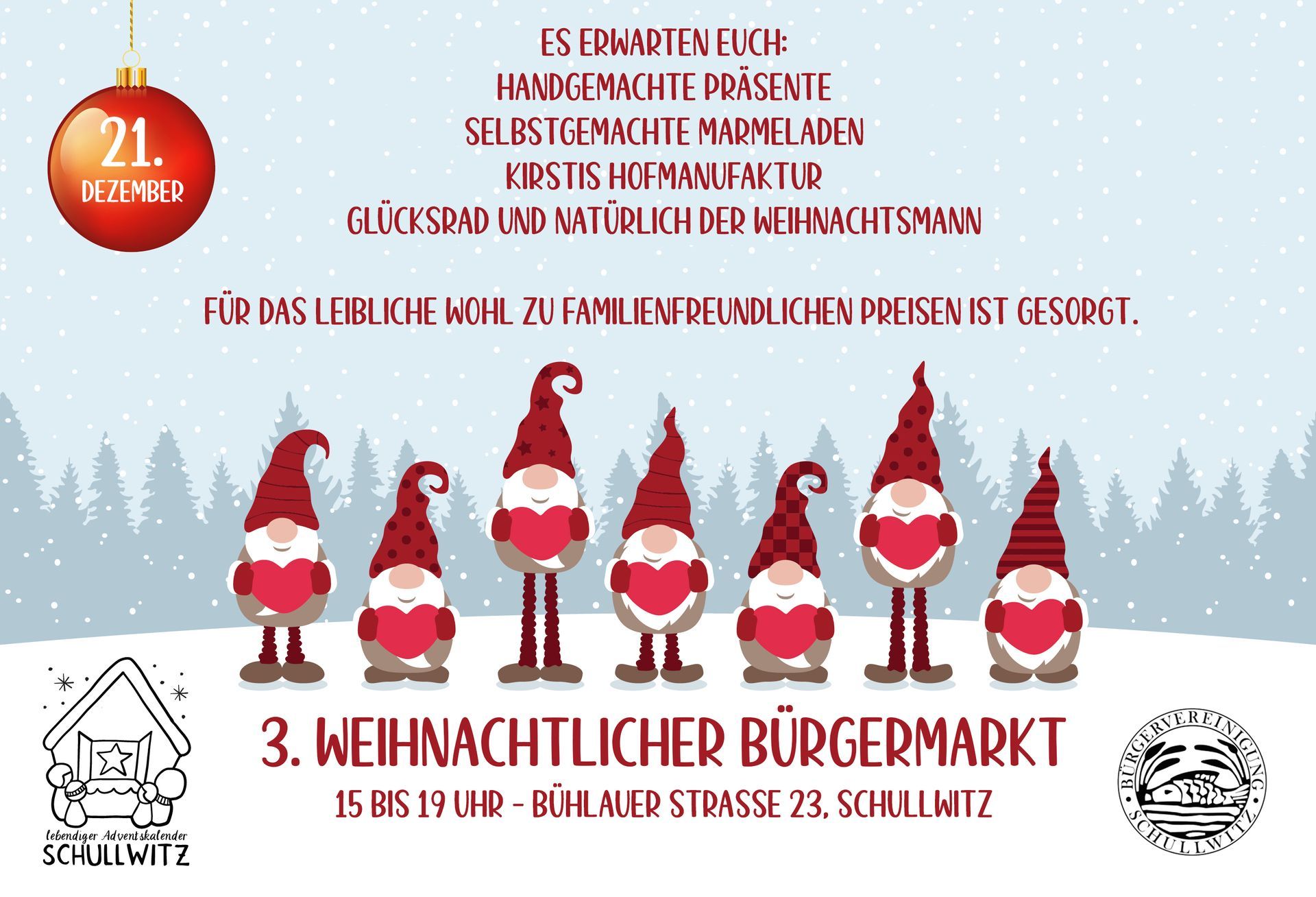 Der Höhepunkt wird auch in diesem Jahr wieder der "Weihnachtliche Bürgermarkt", veranstaltet von der Bürgervereinigung Schullwitz e.V., am 21. Dezember von 15 - 19 Uhr, sein.