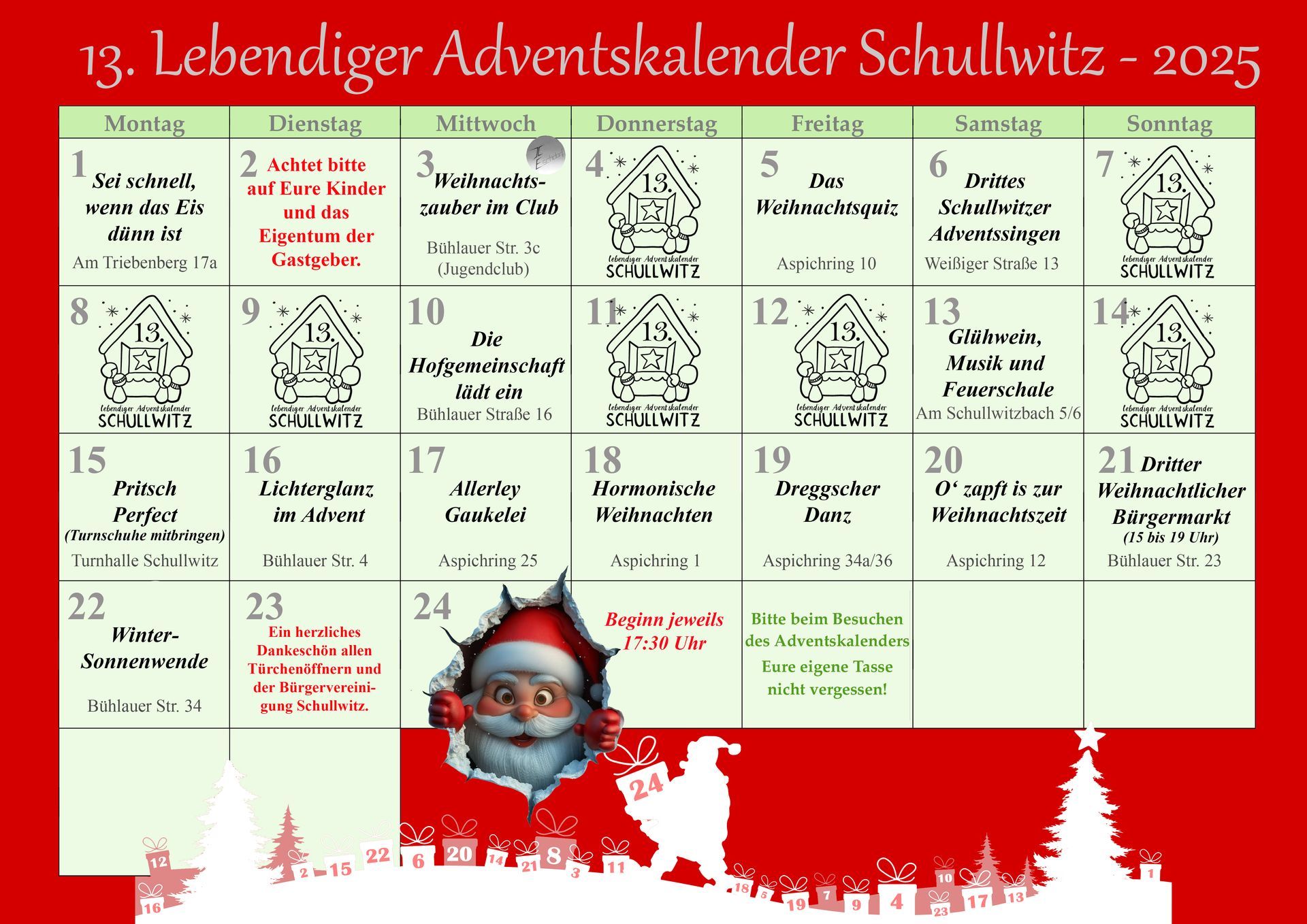 Wollt auch Ihr Teil unseres lebendigen Adventskalender 2024 in Schullwitz sein?